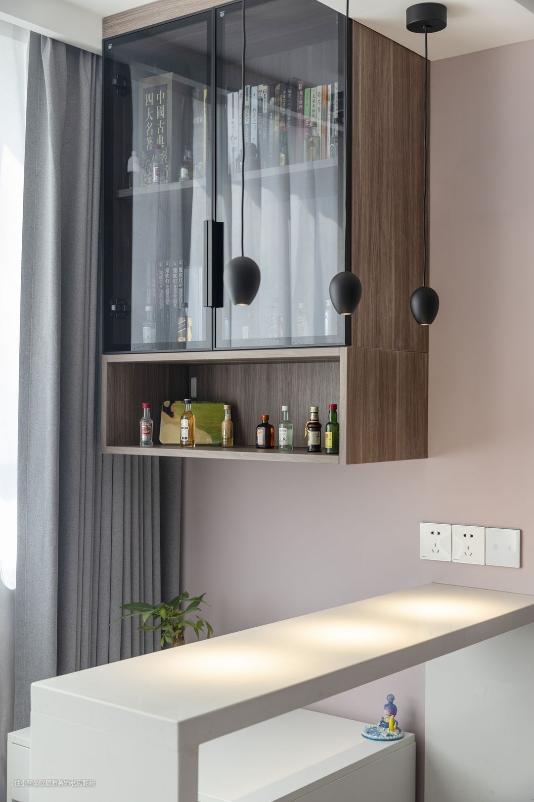 上方深35长75公分的吊柜起到一物多用的效果,上方方便屋主收纳书籍、手办等物品,下方开放格内嵌灯带,作为展示区。整体空间不增加多余的其他颜色造成负担,同时深色的吊柜给予视觉重心,不显轻浮,与橱柜相呼应!