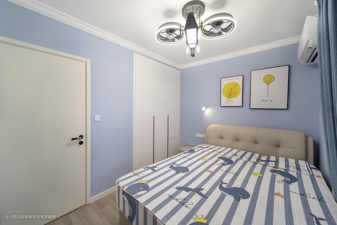 儿童房缩小面积之后,刚好可以做深55公分长1.5米的嵌入式衣柜设计,考虑床头柜遮挡衣柜门,巧将柜门分成二段,方便衣柜使用。