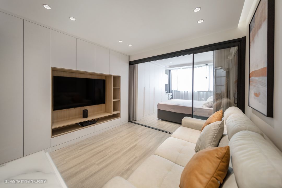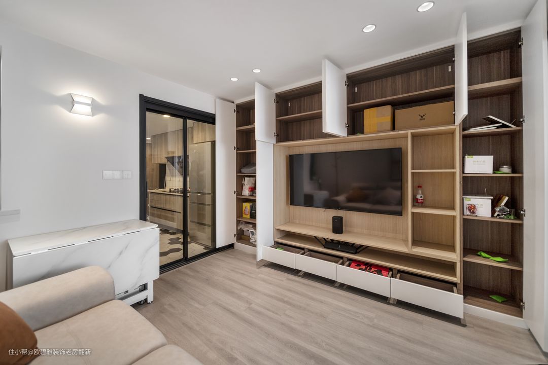对于小户型而言,有限的面积并不是束缚,其实每一平米远比你想象的大得多。 比如本案客厅电视背景墙的设计,根据屋主日常储物需求,设置了整面通顶式储物柜,让55平米的小家拥有超大容量。