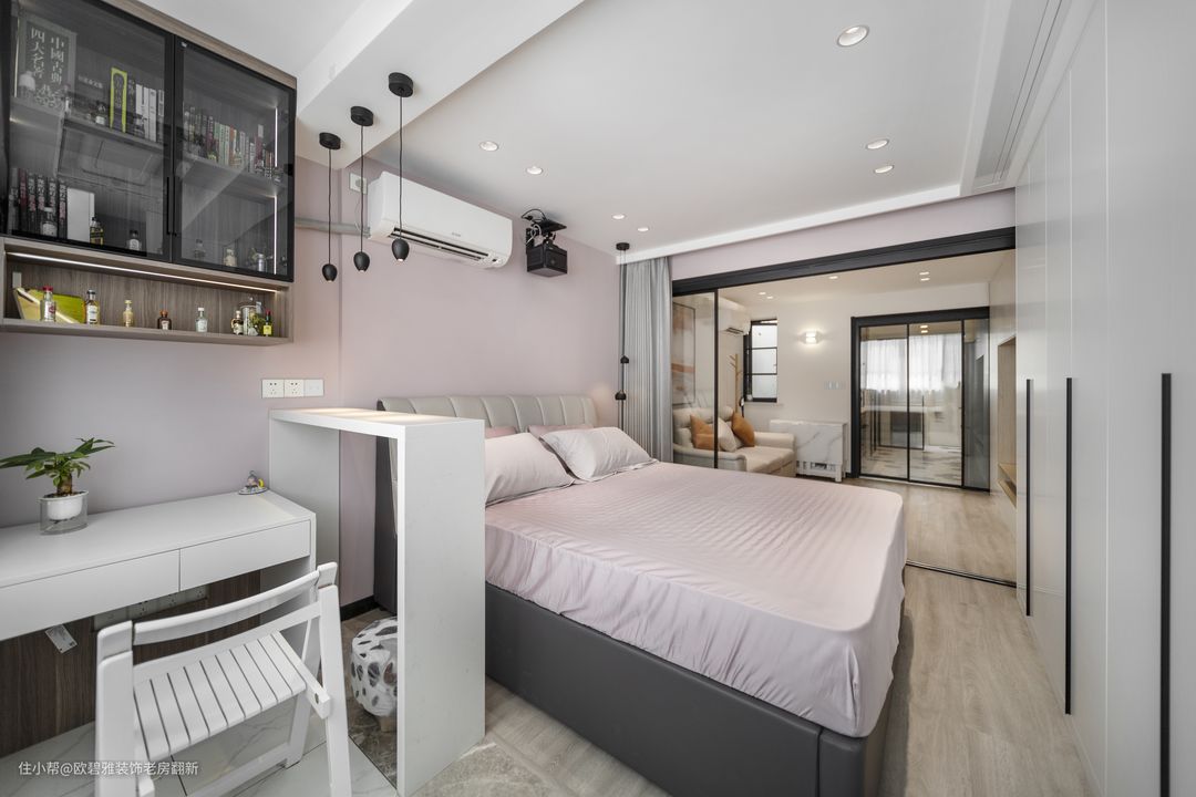 细看主卧是没有床头柜的,一旁长1.2米高1.1米宽30公分的吧台加入,实用感满满。