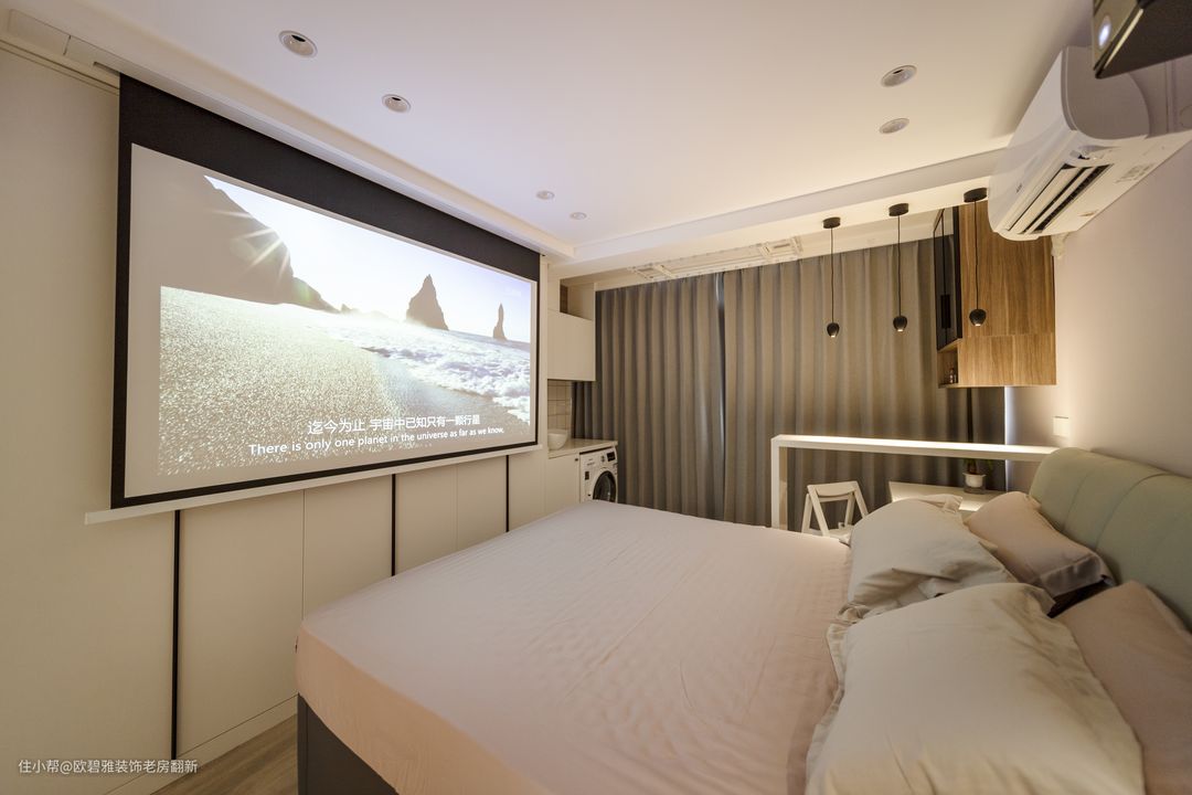 改造后的主卧,将衣柜移至床尾设计多功能组合柜,兼具衣物收纳、洗漱功能以及洗衣晾晒功能,这样设计不仅增大空间储物功能还可以优化原始鸡肋布局和空间采光问题。 衣柜顶部预留凹槽,安装女主心心念念的投影仪,方便实用、还可以一秒切换家庭影院的观感体验。