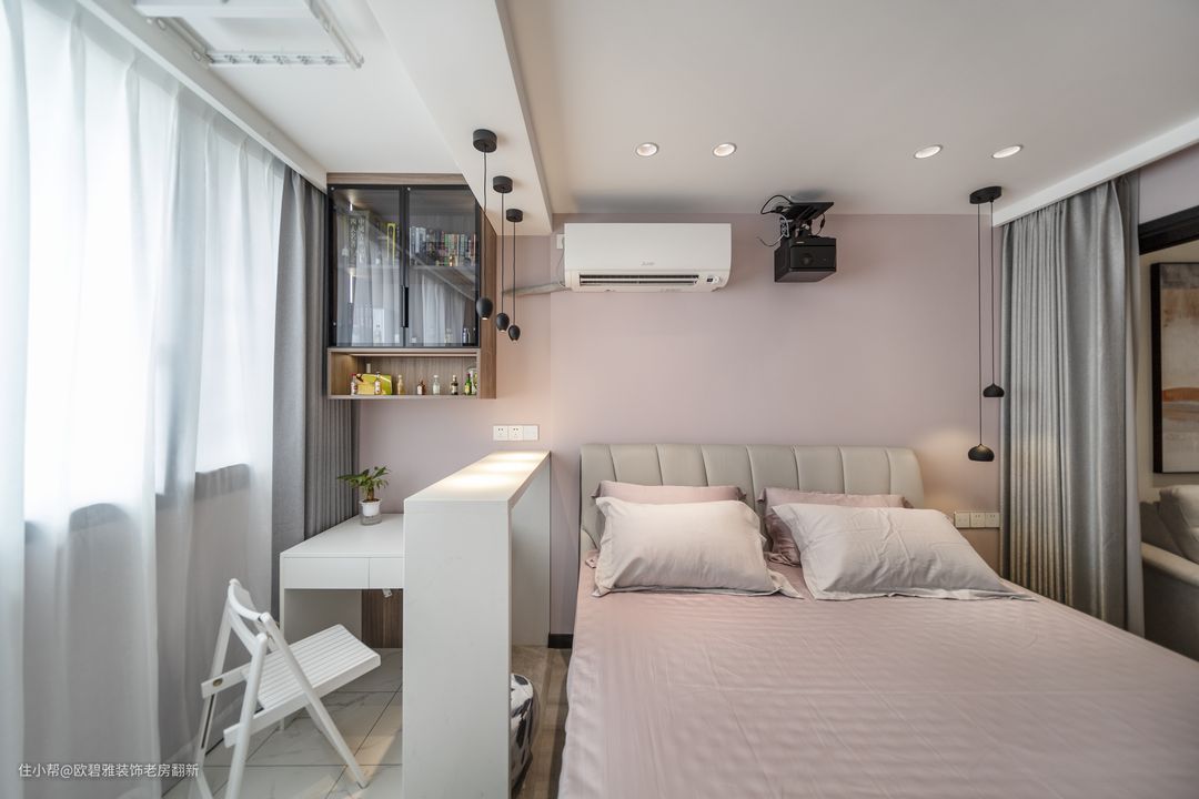 阳台换上了办公区和吧台区,以最开放的姿态迎接阳光的每日来临,沉浸在阳光满屋的房子里,总是更容易让人感到幸福。主卧采用粉色为主调,黑色线条吊灯点缀让卧室既简约舒适,又自带现代时尚气息。