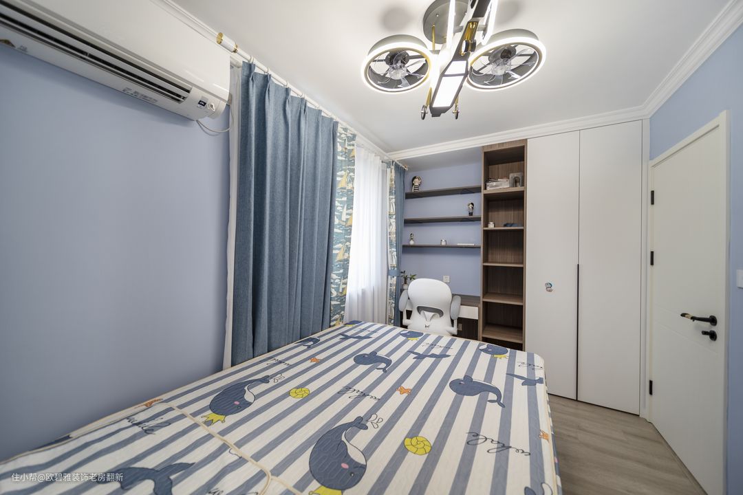 儿童房床尾设计组合柜,兼具衣柜、储物柜、置物架以及学习桌等功能,使9m²的空间达到5m²的收纳效果。 考虑环保性和空间层高问题,选用“雷神山”同款网红强化复合地板,不打龙骨直接铺贴,环保又舒适。