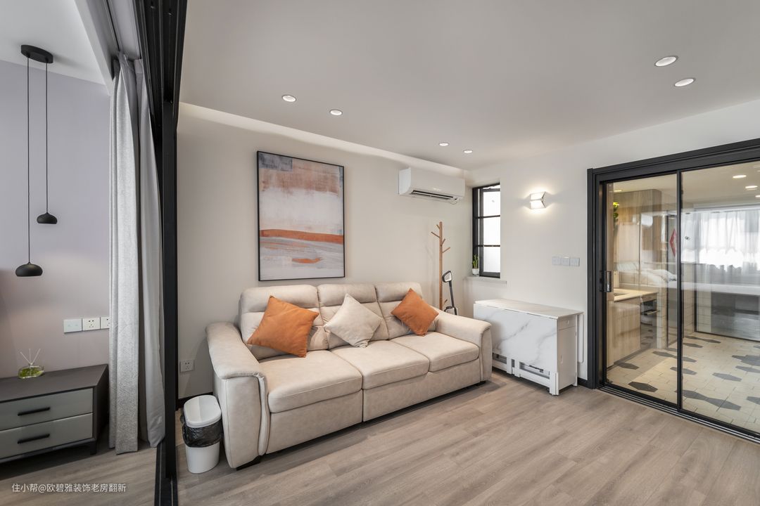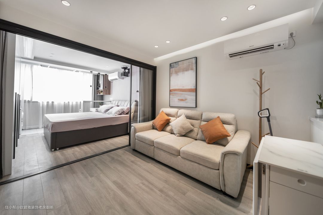 『教科书级小户型扩容术,实用到爆』 玻璃移门+窗帘,可随时切换封闭式与开放式两种空间,大大改善了整个空间的采光条件与逼仄状况,还扩大了空间的视觉面积。