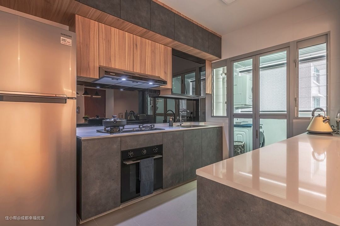 厨房灰色的橱柜设计,看起来很有质感,有种莫兰迪色系的感觉,与客厅的电视墙呼应,也是空间整体协调性的统一。厨房的两边都做了门窗,给厨房的空间增加了充足的光源。