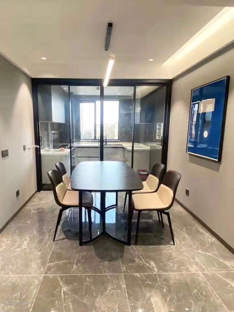 一字式餐厨一体设计,采用玻璃推拉门阻隔,分割出厨房与餐厅的生活区域。避免了开放式厨房油烟不好打理的的弊端,组合式的餐桌与餐椅,同时增加了用餐的生活仪式感,线型灯的设计更是让空间有了氛围格调。