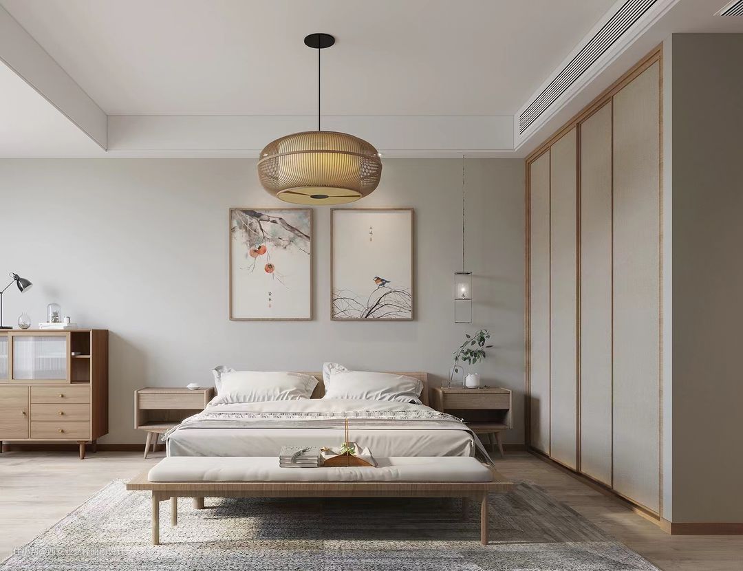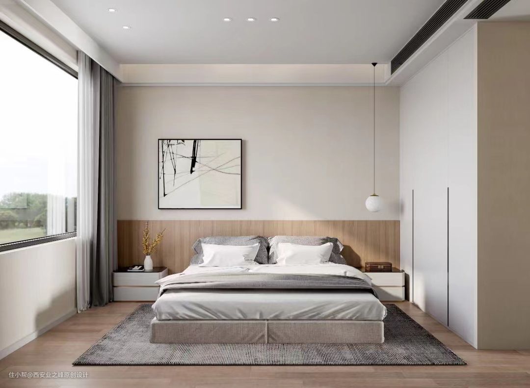 卧室肤感柜体通顶衣柜搭配上浅色木质的地板和床头柜柜,满足了视觉上的享受。背景墙使用简单的挂画做为装饰,效果上简单又具有意味。