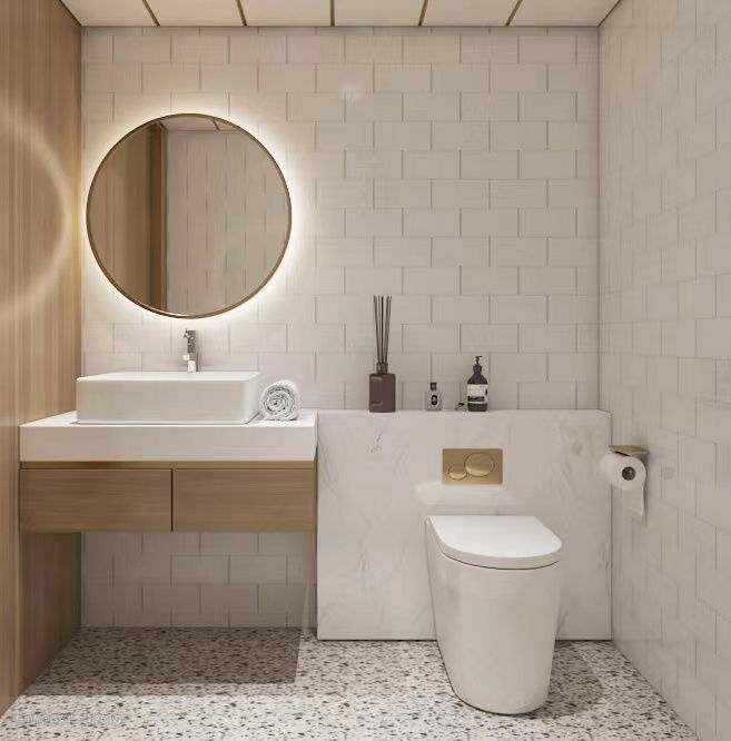 工字形拼贴白色墙砖,与原木色的洗漱柜相互融合,拉远整个空间,让空间更加大气。
