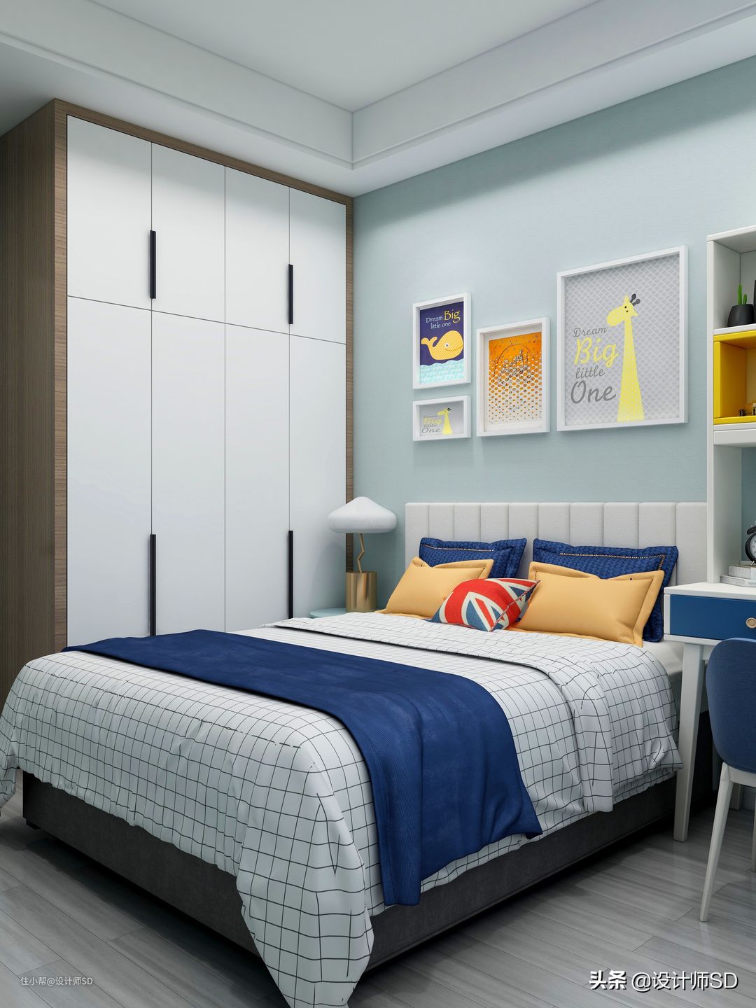 男孩房跟女孩房的空间布置得一样的,顶面的造型吊顶也都用石膏板做出了叠级效果,更加的有立体感,墙面的乳胶漆则是没有区分什么墙面,而是用同一种的色系。书桌的样式跟女孩房的书桌样式基本一致,只不过是改变了抽屉的颜色呢,男孩房的抽屉就换成了蓝色的,床的样式非常的简约,浅色的床头靠背搭配床头背景那么墙的一组装饰挂画,可爱又漂亮,衣柜的样式同样的用木色柜板搭配白色的柜门,整个房间看上去清爽简约又实用。