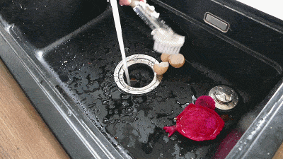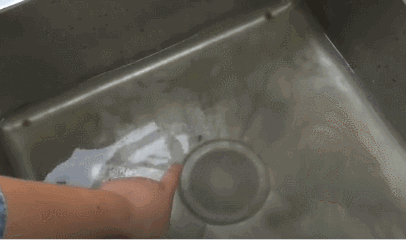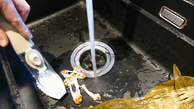 使用起来也很简单,第一步先打开水龙头,在流水的冲击下,把垃圾缓缓塞进下水道里,像这样的鸡骨头不到一分钟就消失的干干净净了。