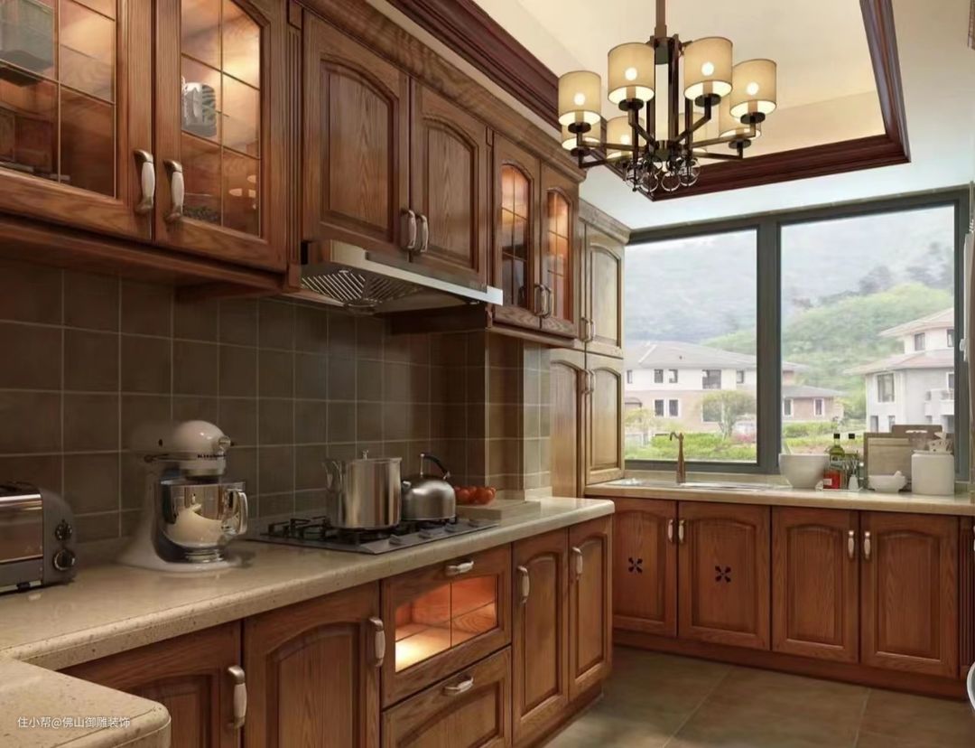 厨房在美国人眼里都是开放的,同时需要具备一个便餐台在厨房的一隅,还要具备功能强大而又简单耐用的厨具设备。需要有容纳双开门的冰箱的宽敞位置,还要有足够方便的操作台面。在装饰上美式田园风格也很讲究,比如喜好仿古的墙砖、橱具门板喜好实木门扇或白色模压门扇仿木纹色,另外厨房的窗户也喜欢配置窗帘等。