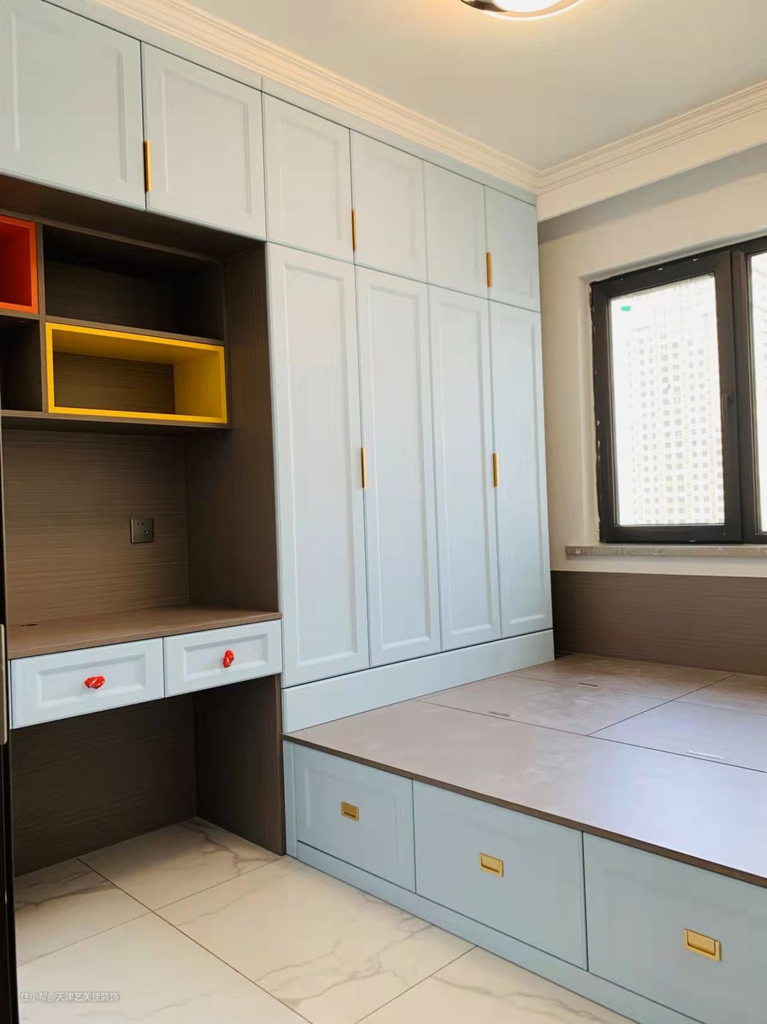 不同于颗粒板,欧松板是采用片状实木制作而成,防水防潮,板材延展性好,柜门柜体都可以使用。#全屋定制#装修#天津装修#板材#艺美佳装饰