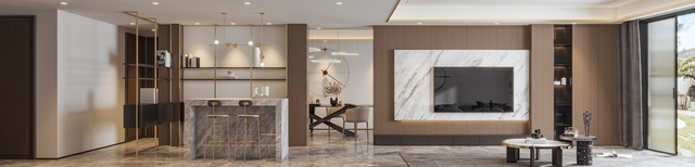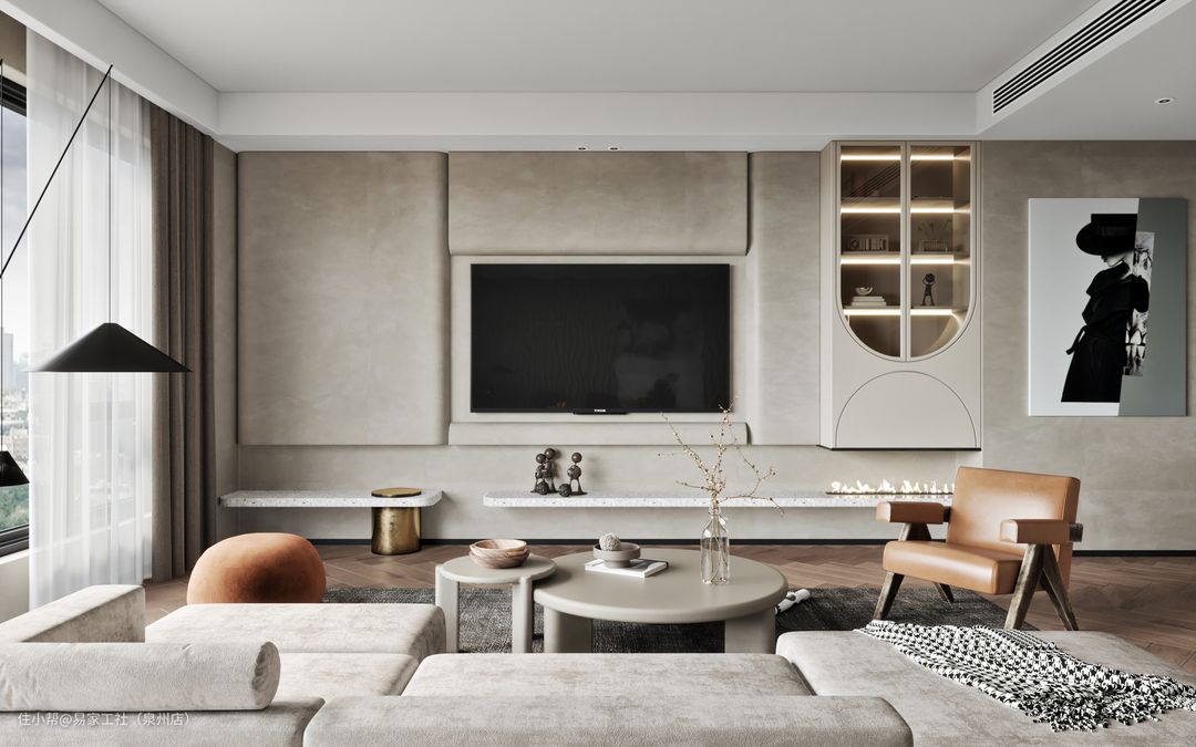 成品电视柜是之前装修时最常用的方式,如果觉得定制设计太过繁琐了,可以将电视背景墙空间预留出来,后期根据设计风格与需求来购买成品电视柜进行搭配:木质款、岩板、玻璃组合。