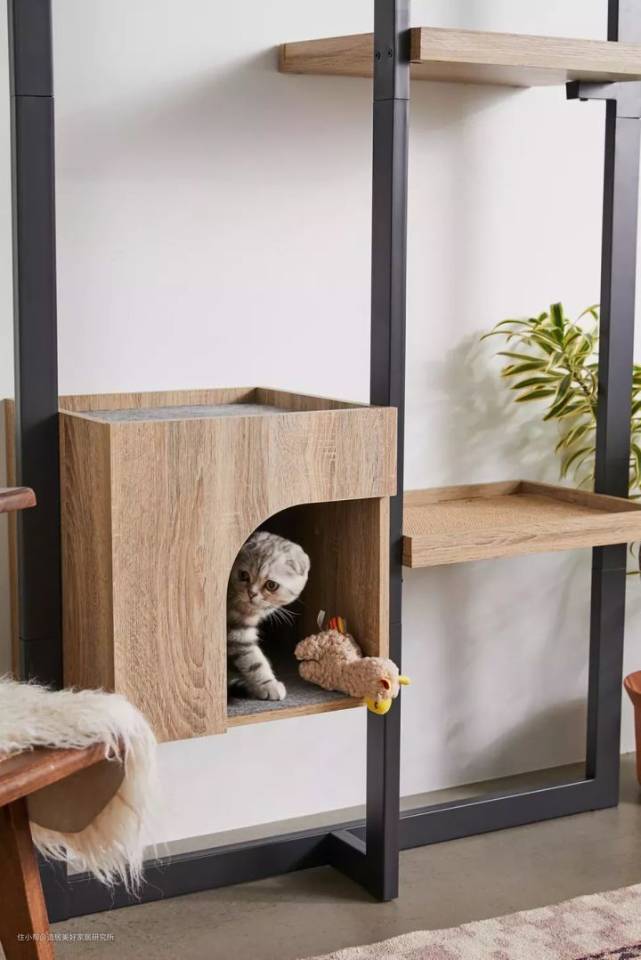 如果是养猫咪,可以利用楼梯、墙面、飘窗台等区域,打造一个专属的猫咪乐园,设置猫爬架、安放猫窝和猫爪板。