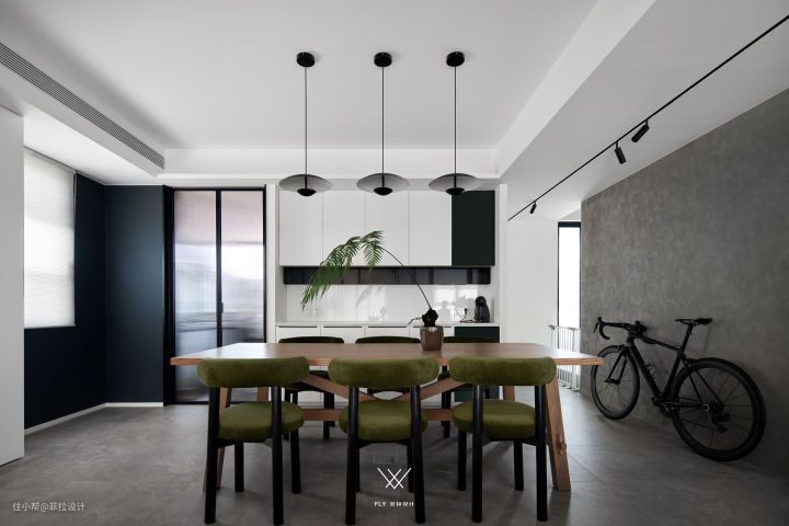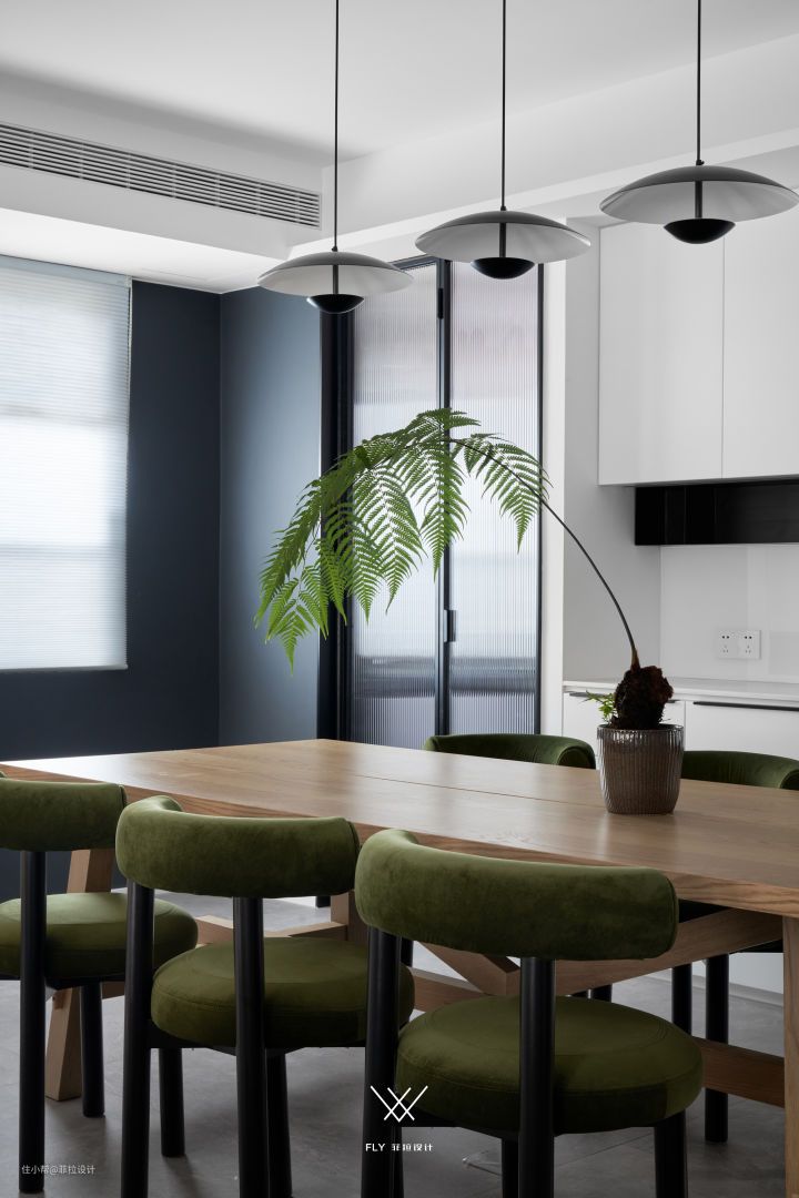 餐厅吊灯小小的三个连成排,莫名有乖巧可爱的感觉。餐厅中加入吊灯其实是很能烘托氛围感的物件,是细节控不能错过的小心思。绒质的复古绿餐椅,合围式的包裹状,很有设计感的同时又透露一点小俏皮,餐椅来自我们菲拉定制~