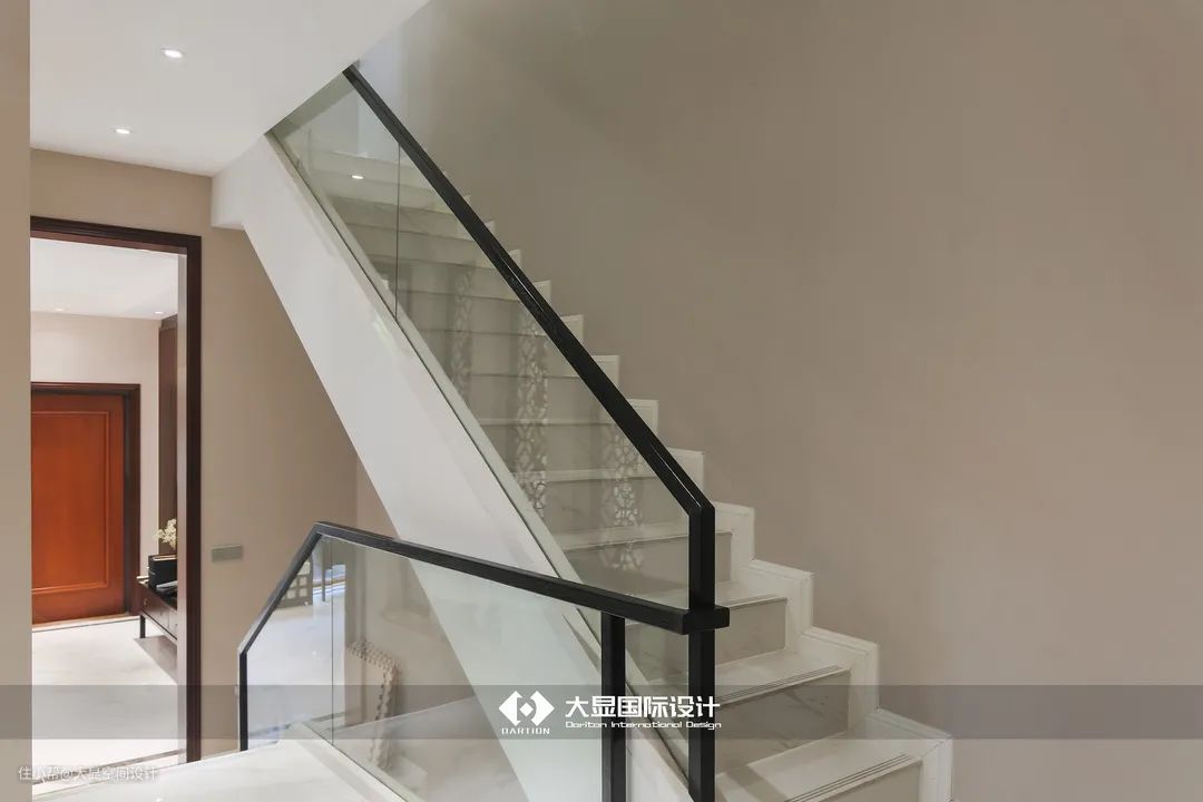 楼梯这里也没有使用传统的中式楼梯,而是使用黑色边框玻璃的搭配,现代感很强,同时也与客厅的色调相呼应。