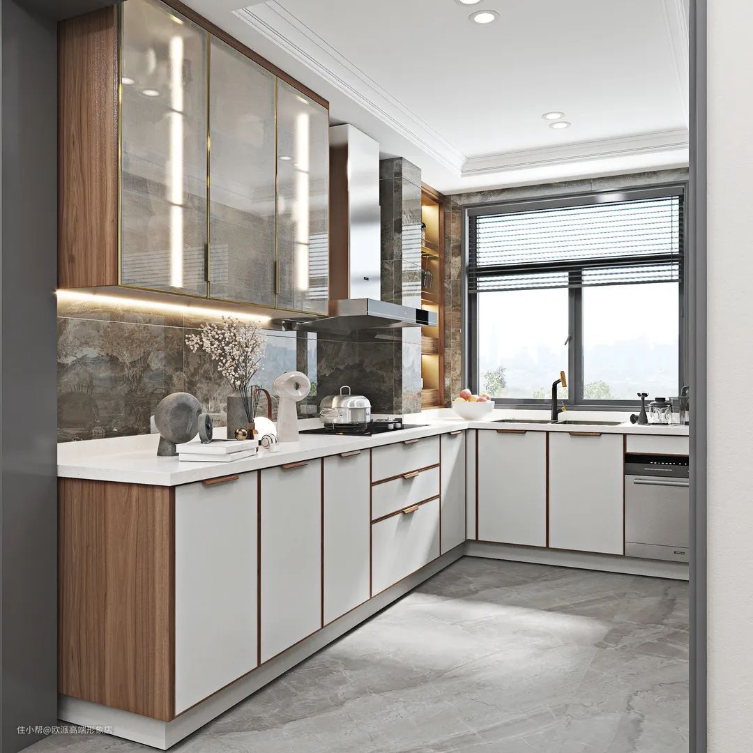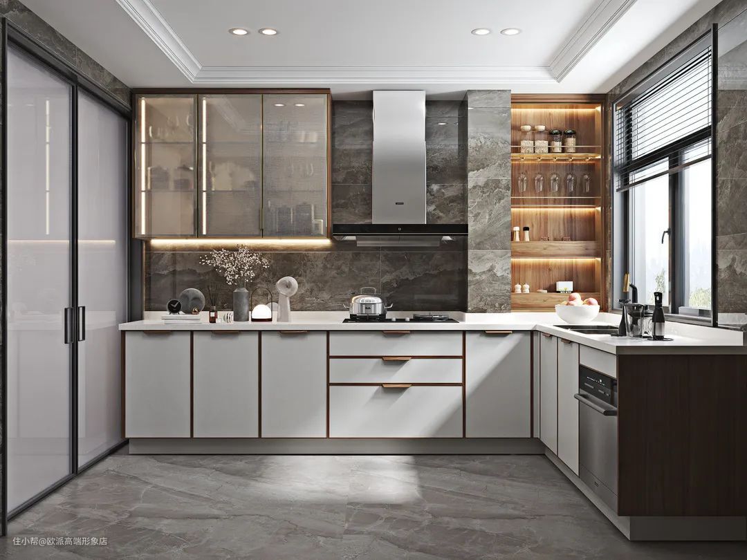 橱柜的设计也可以选择玻璃橱柜和部分开放格,能够让老人使用厨房的时候物品一目了然,不用打开柜门后一通翻找。