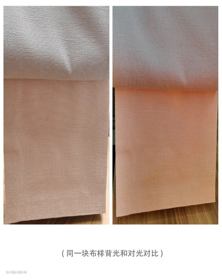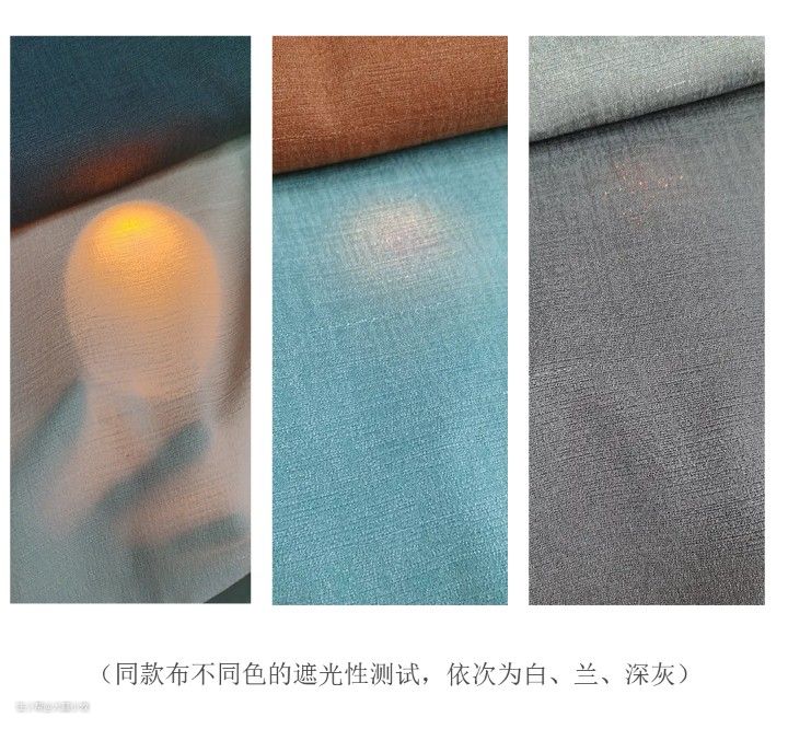 比如同一款遮光率在95%以上的遮光窗帘,颜色深的一定比颜色浅的遮光效果更好。在选布料的时,可将光源放于背面且离开一定距离照射观察遮光效果。
