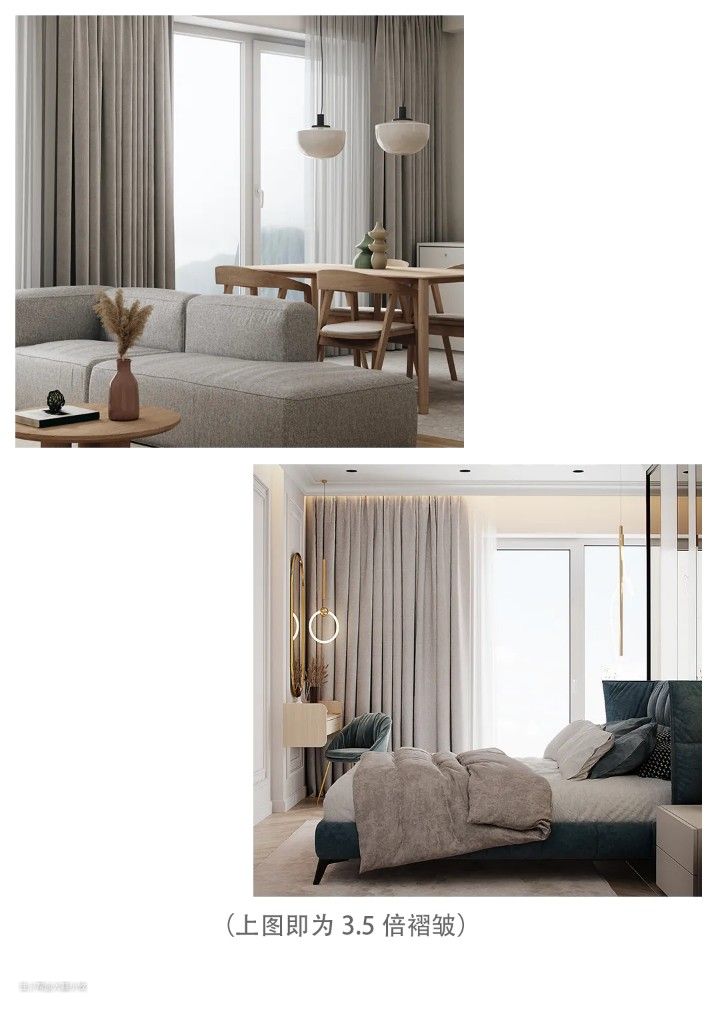 在我设计过的样板房里,规定布帘的褶皱倍数是窗户宽度的3.5倍,纱帘是2.5倍,褶皱过多会略显厚重。结合性价比和实用度,推荐家用的倍数是布帘2.5倍、纱帘2倍。