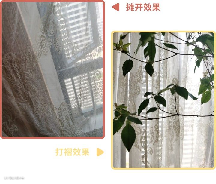 比如我家挂了十年的这款带花纹的纱帘平摊开来看是左图,但折起来(右图)又是另外一种风味。