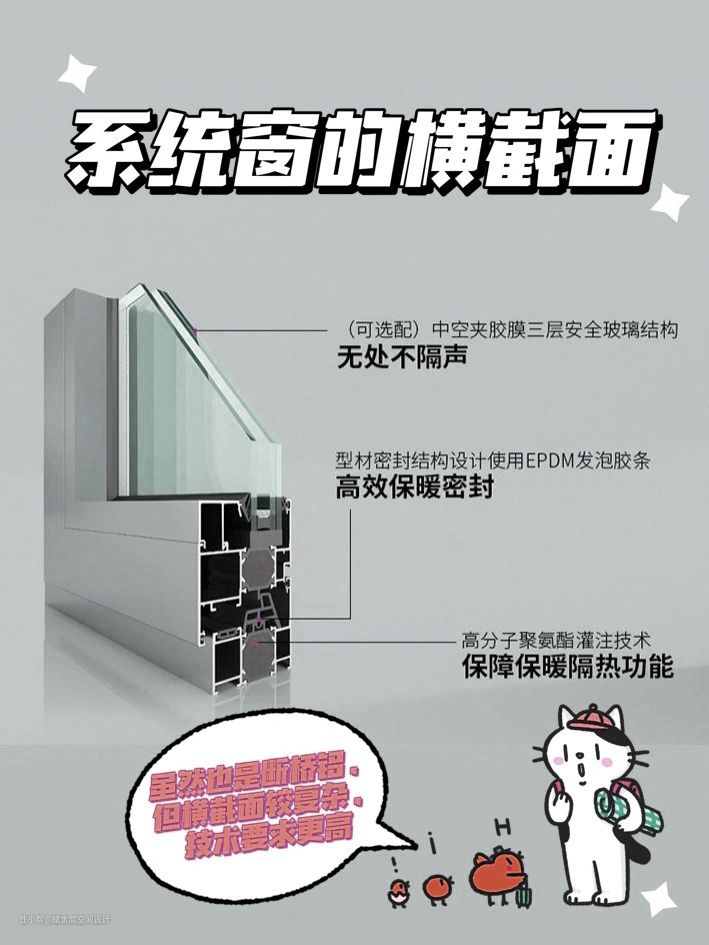系统窗是断桥铝合金窗里的高端窗,但断桥铝不一定就是系统窗。真正的系统门窗整体性很强,有特定的型材、增强、附件、密封、五金、玻璃等组件