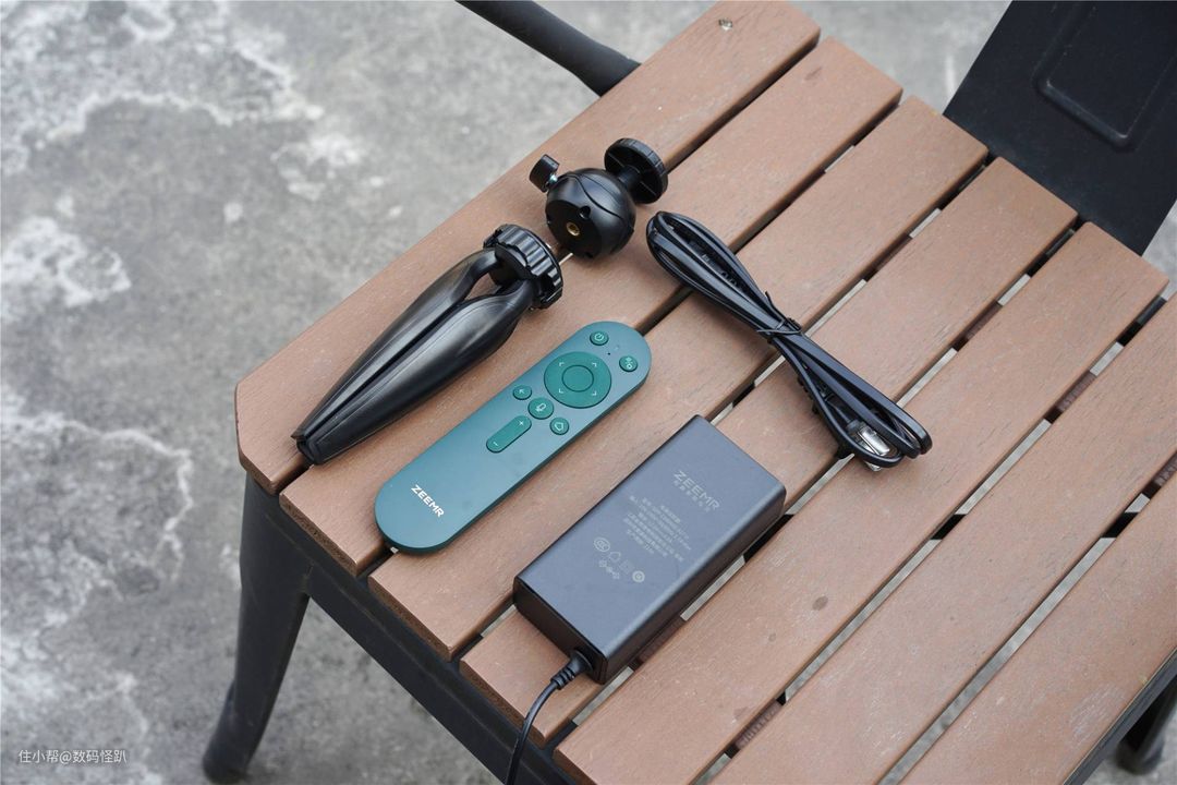附件清单除了知麻M1 Pro主机外,还提供有一个可单独调整投影角度的小型三角架、遥控器、电源线、电源适配器及产品说明书等物品。