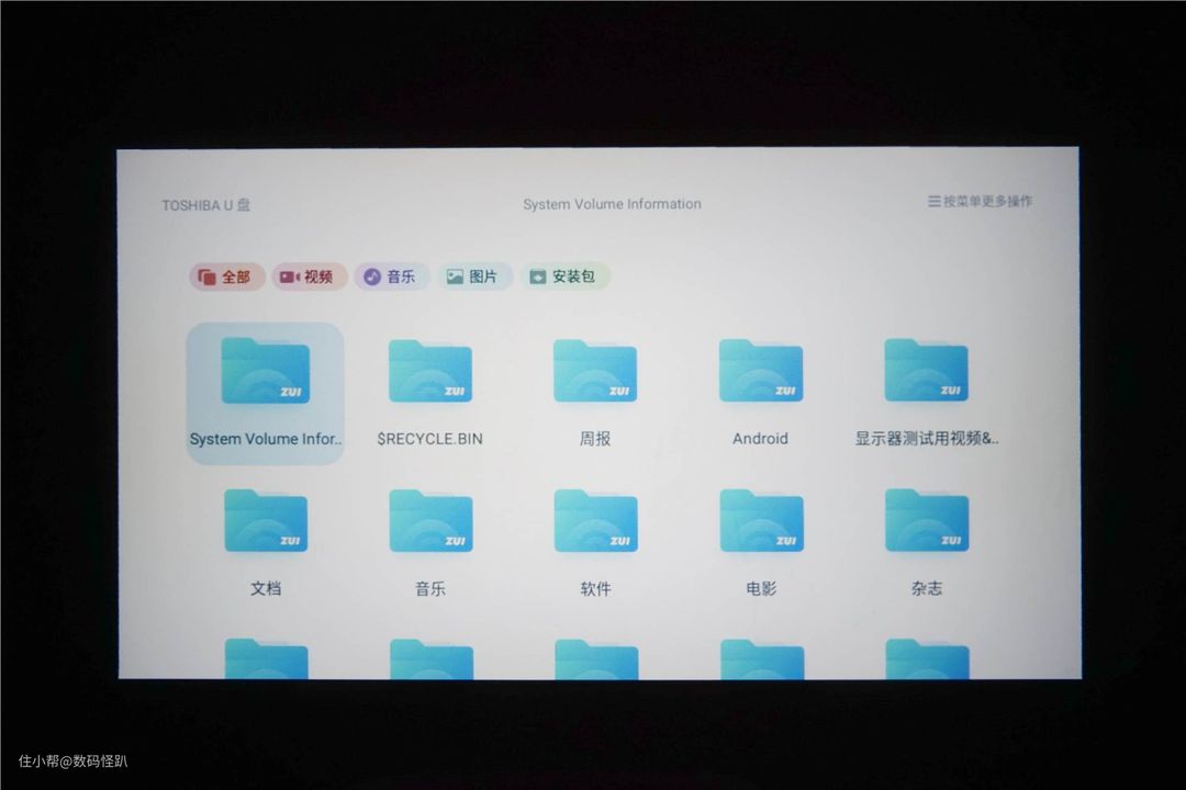 USB口插上的是东芝固态移动硬盘,插上后状态指示灯就开始快速闪烁,识别速度很快。进入媒体中心选择TOSHIBA U盘,文件夹、图片、视频等格式显示没什么问题。进一步选择视频、音乐、图片或安装包也很正常,打开速度还挺快的。