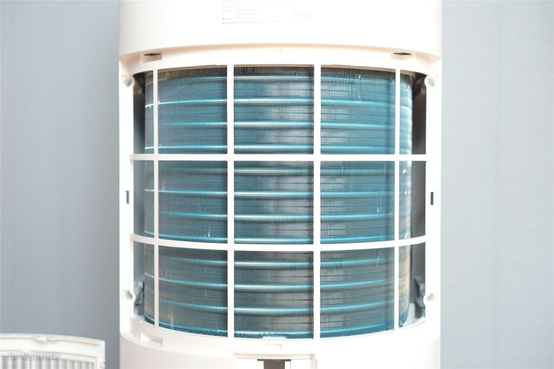 进风格栅采用了可拆卸式设计,下面这个就是取下进风格栅后看到的米家智能除湿机22L的核心组件,主要有压缩机、风扇和12排冷凝管和密度很高的蓝色翅片组成。