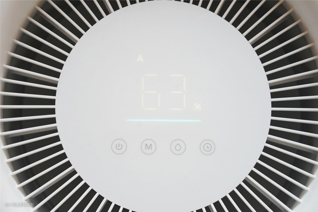 环状的出风格栅中间的是米家智能除湿机22L的显示屏及操控面板。数显大屏搭配下方的三重灯光指示(橙色代表干燥:相对湿度<30%、绿色代表舒适:30%≤相对湿度≤70%、蓝色代表潮湿:70%