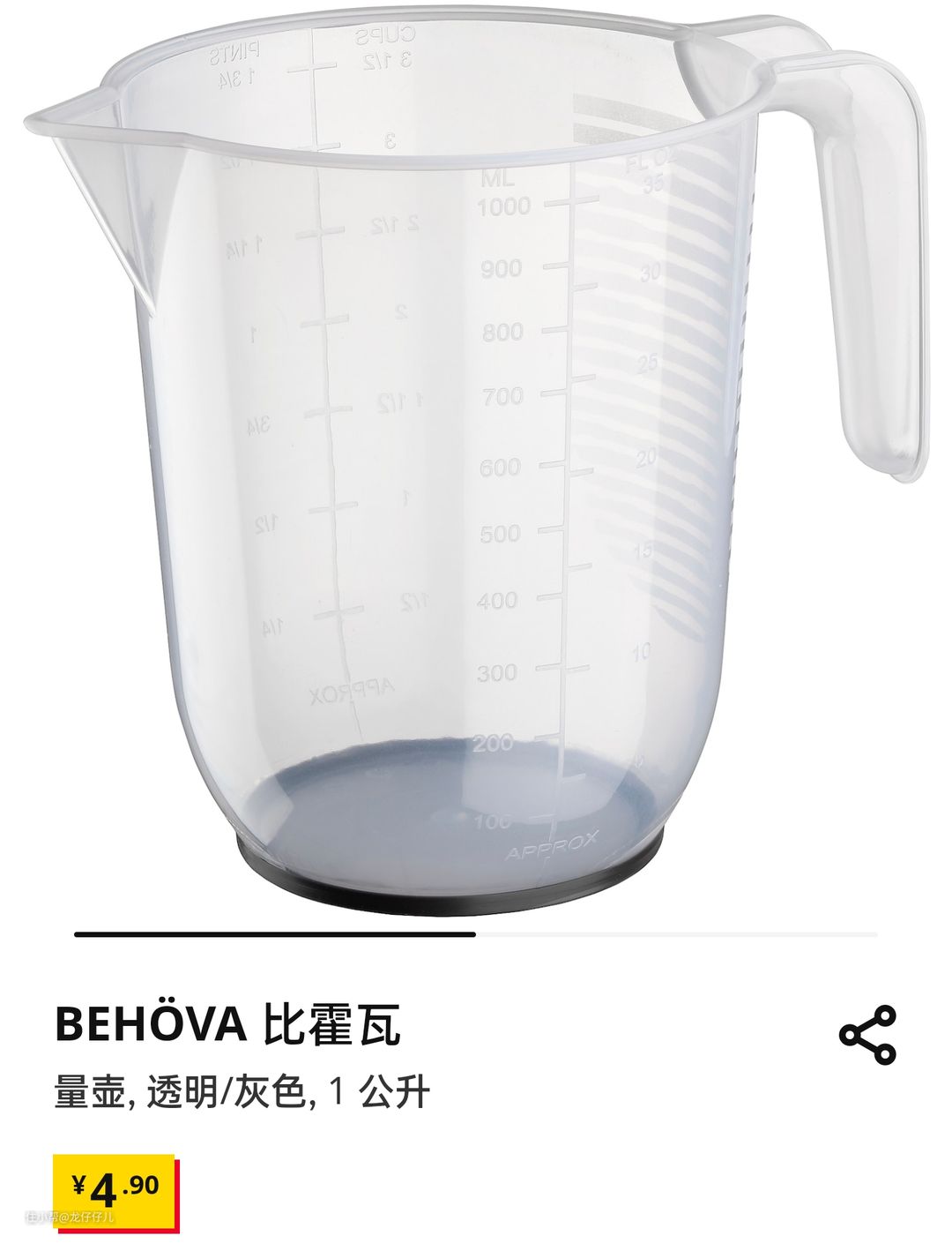 有一升的容量,4.9元四舍五入不要钱,锅中加水神器,是可以进洗碗机的塑料材质。