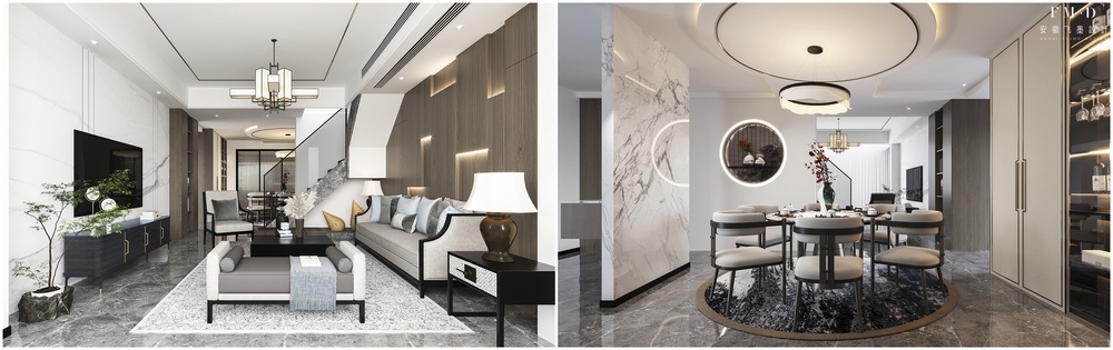 ④墙上设计圆形壁龛作为端景,跟餐桌相呼应拥有独特美感。