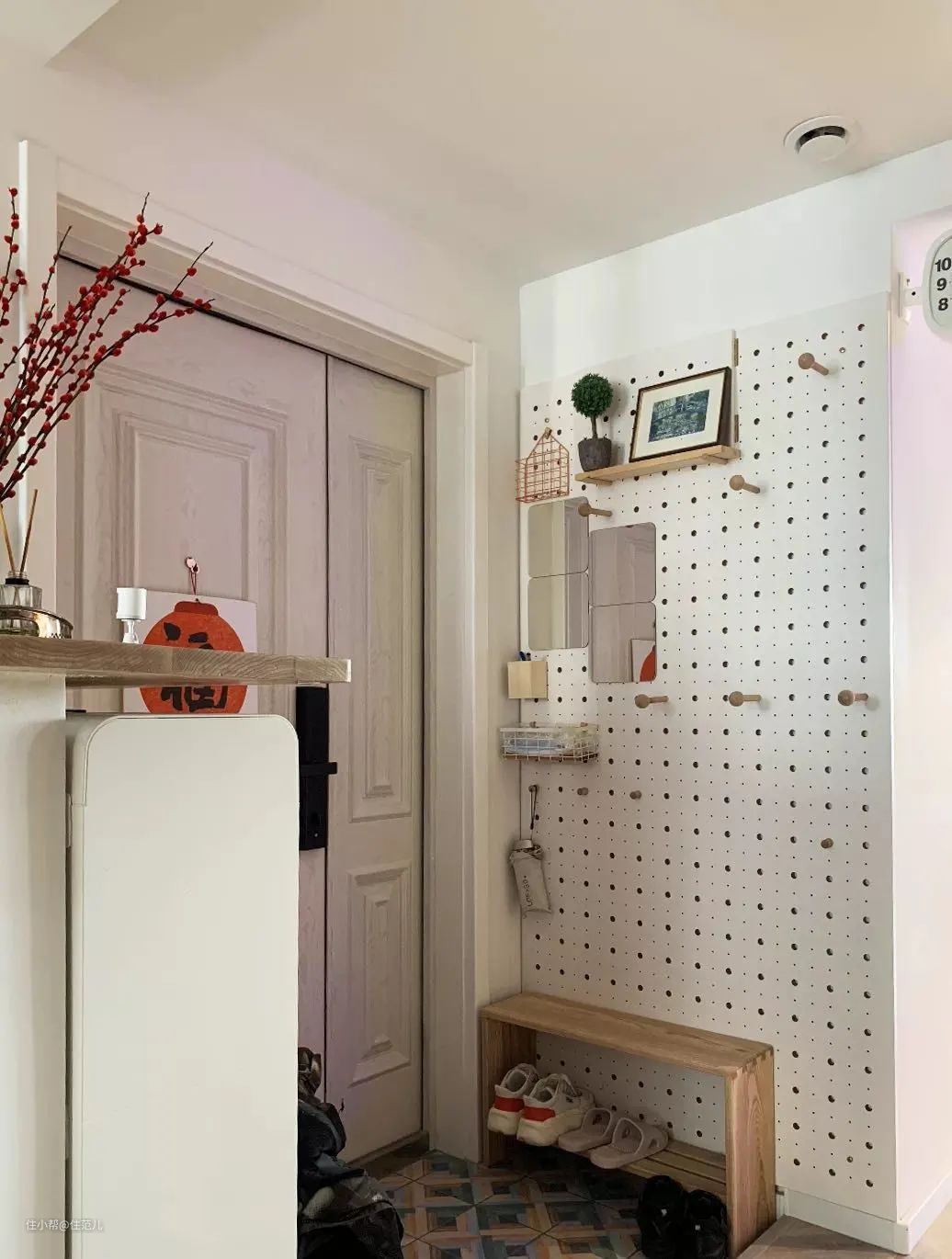 入户门门后的大白墙也可以利用起来,装一整面洞洞板。