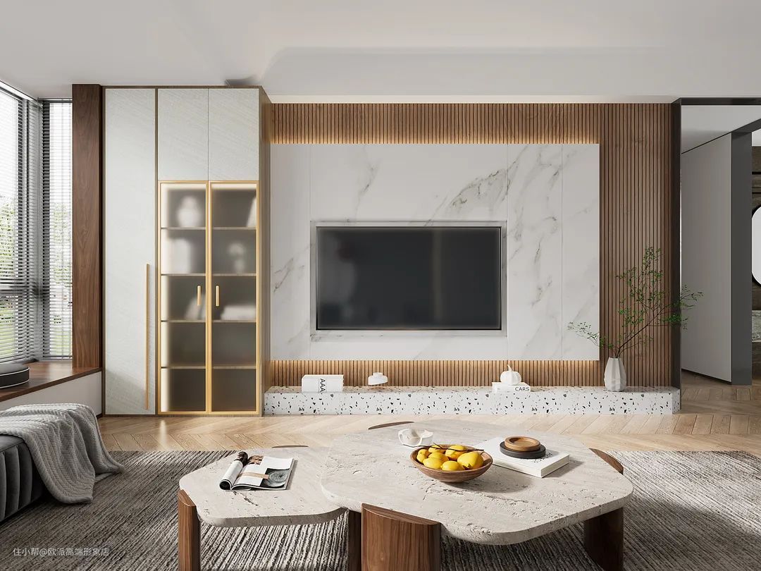 在侧边打造到顶收纳柜,电视下方预留石材台面,整体看起来非常舒适。