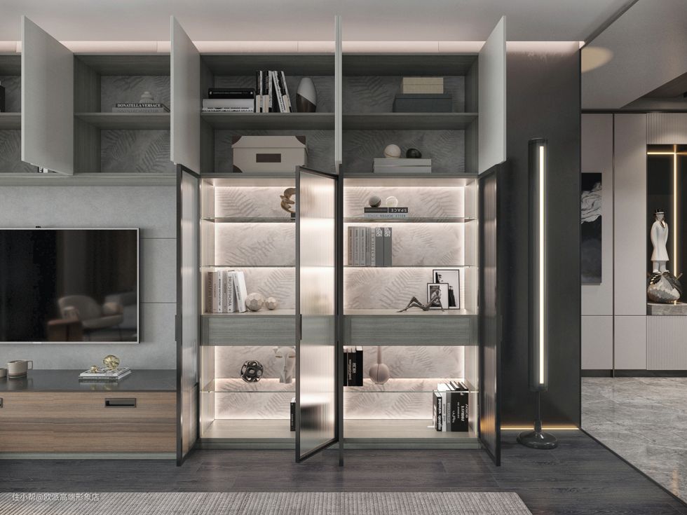 带灯玻璃柜,质感非常高级,显著区别于其他柜体,不仅提高了电视柜的整体颜值,还把客厅的氛围感拉满。