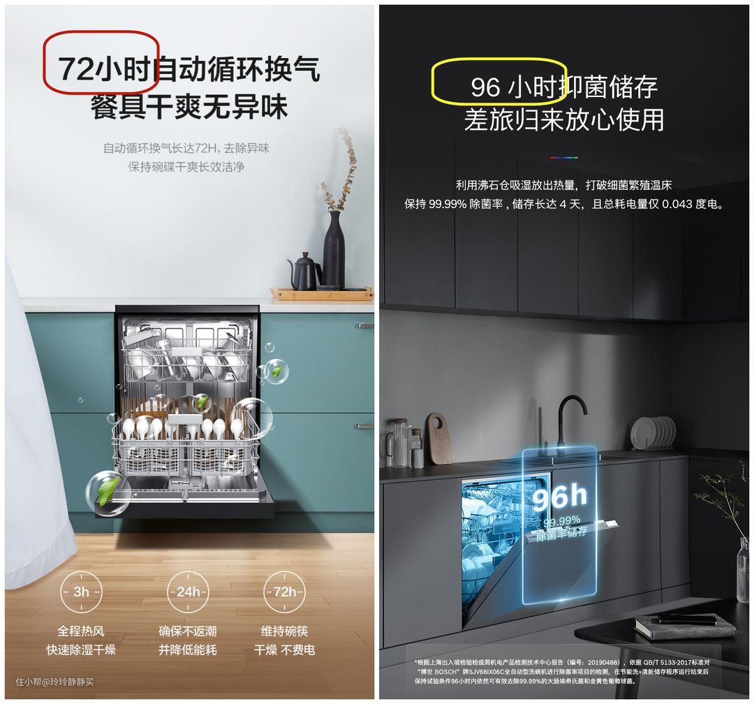 因为更好的烘干方式,配合杀菌消毒功能,现在很多洗碗机提出了长时间存放餐具的卖点。毕竟节省了橱柜空间,省了碗架柜,对于寸土寸金的厨房空间是好事。而各品牌之间的差异,主要在存储时长上。72小时是入门,96小时稍好,现在已经有了168小时(7天)储存的了。
