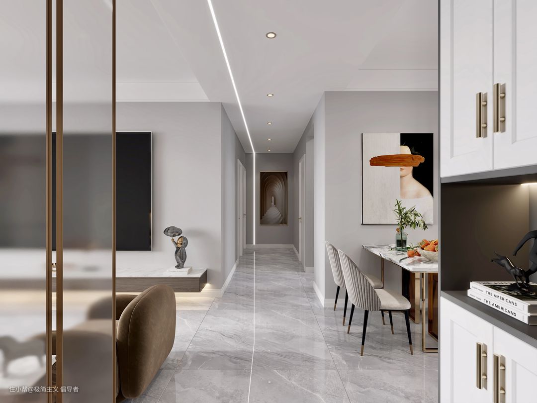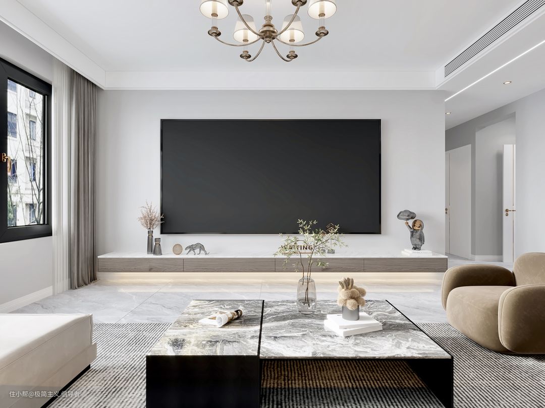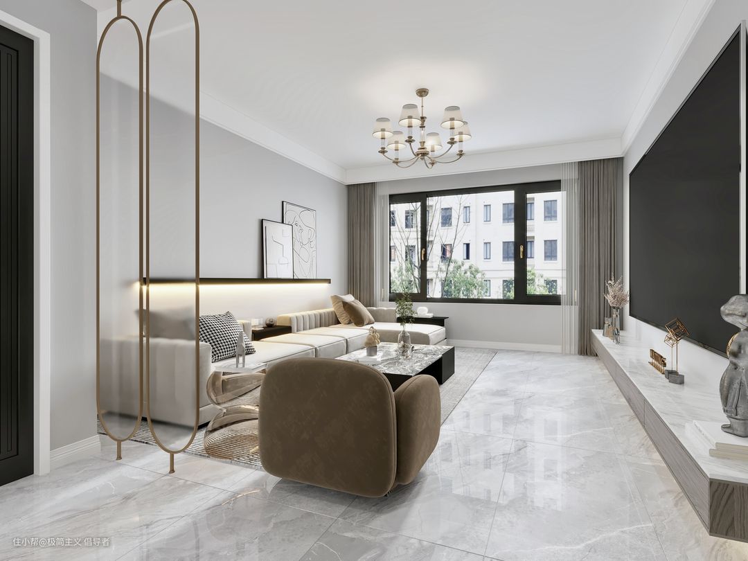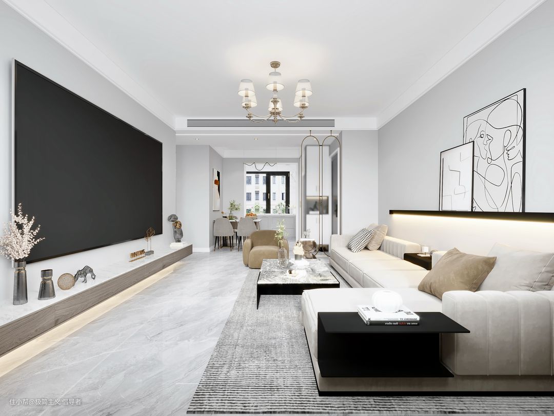 客厅的设计给人柔和沉稳的气质,没有复杂的木饰面和大理石,背景墙放激光电视,沙发选用浅色科技布经典不过时。