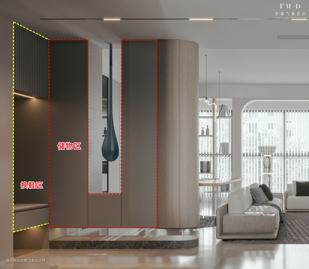 ①右侧墙壁嵌入换鞋凳,底部悬空,顶部设计吊柜,柜子隐藏灯带,坐着换鞋才是最舒服的;