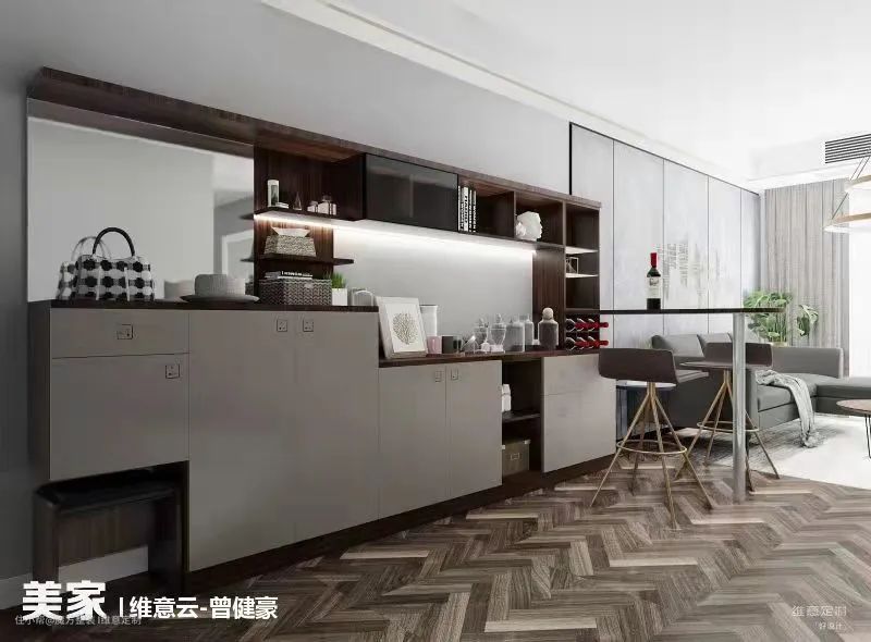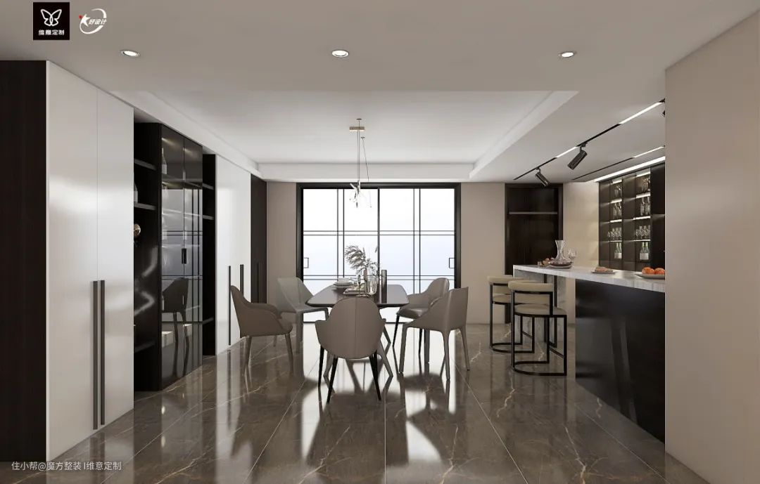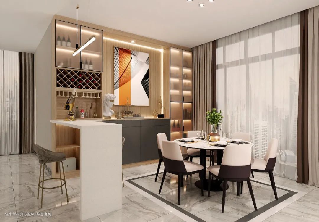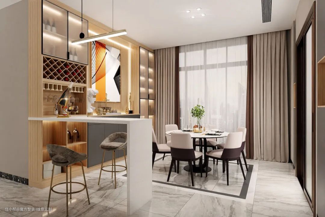 餐厅旁边做吧台也是很多家庭的选择,一般会和餐边柜组合在一起设计,台面空间也更宽敞。