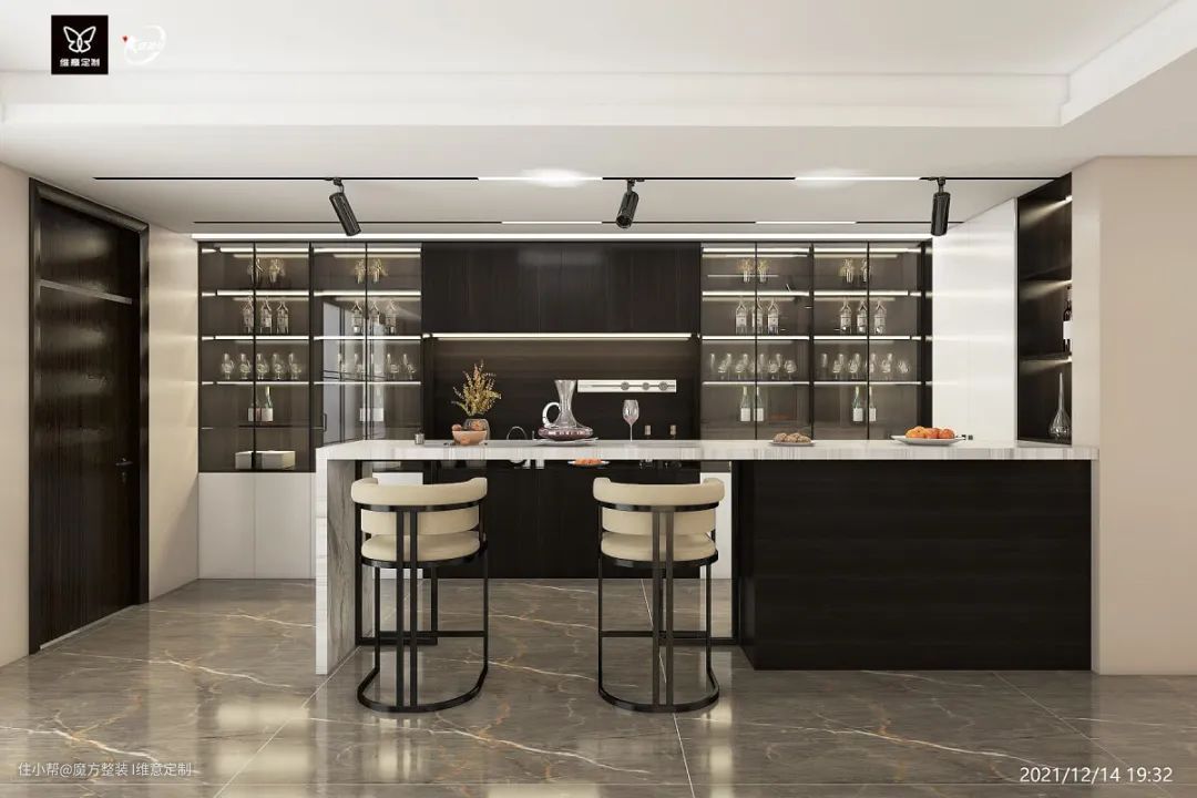 3、吧台的位置:装修时要将吧台融入整体空间,而不是单独一件家具。而且要考虑好周围的动线走向,使用起来更舒适。