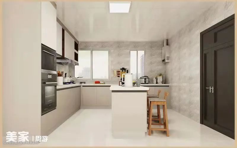 厨房中岛台设计,风格是传统跟现代的结合。提供放置处理食材或者一两个人用餐的工作台,也是比较常见的厨房设计。