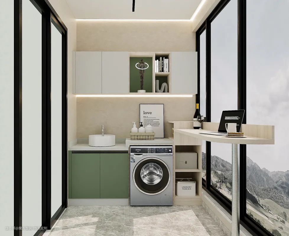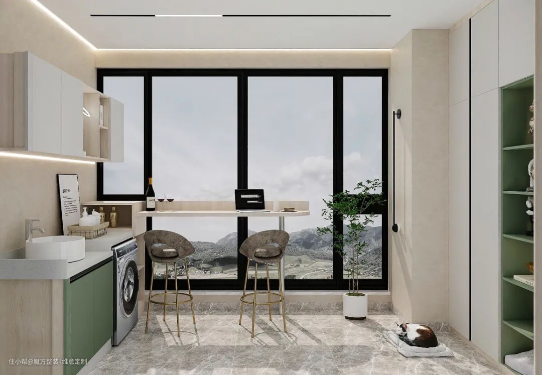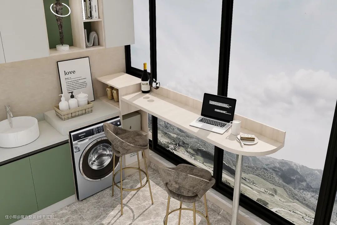 封闭式工业风居家阳台,储物与展示兼具的柜体设计,吧台与洗衣柜的结合让空间更加协调,休闲办公,喝酒聊天,很是受年轻人的喜爱。