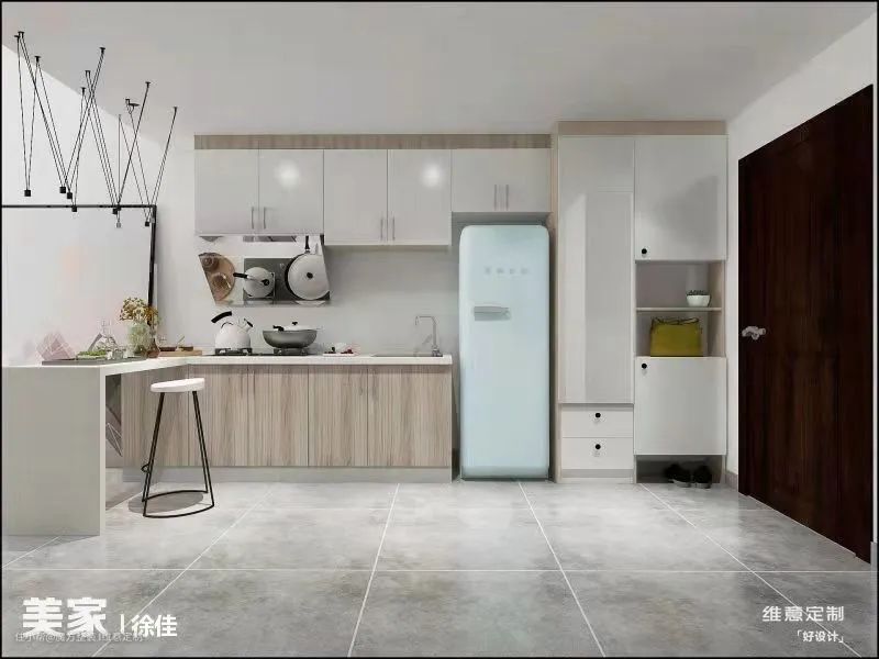 小户型单身公寓也适合放置吧台当餐桌使用,进门处的鞋柜和橱柜形成整体,橱柜再延伸吧台,台面既是就餐区也是传菜区。如果朋友聚会,还可以提供一起做美食的空间,增进情感的互动。