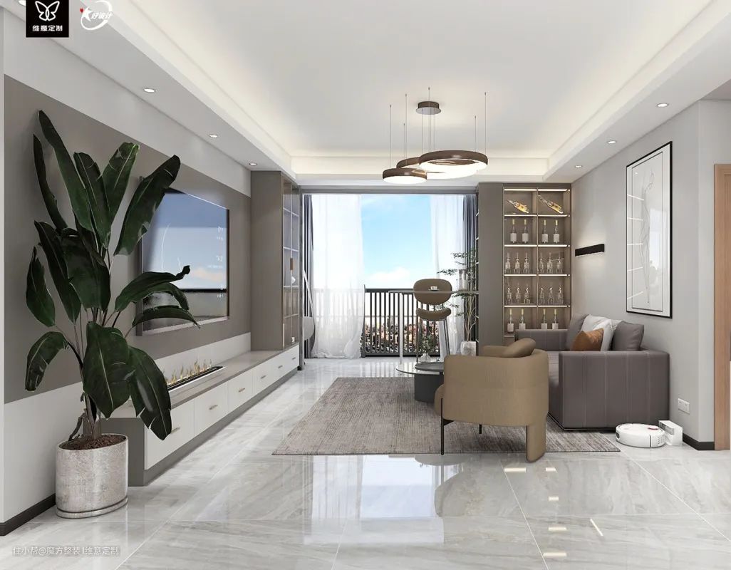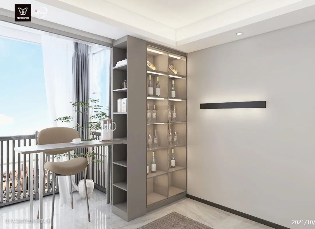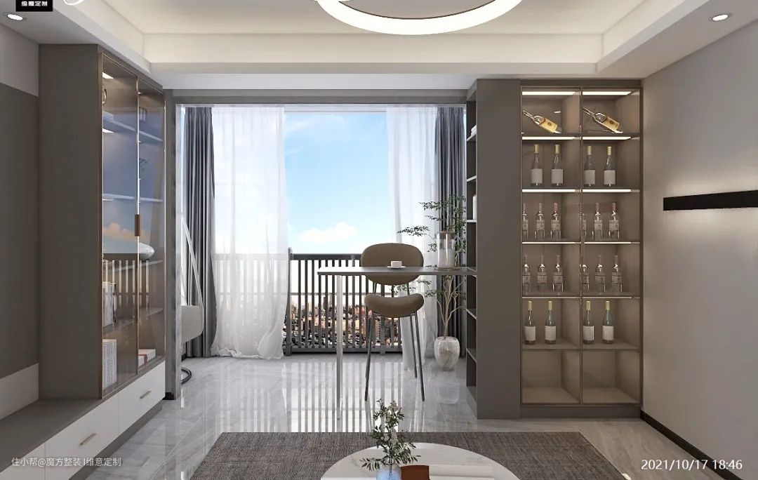 客厅阳台打通,做吧台,与吧台连接的是一个半开式茶色玻璃酒柜,也分担客厅的一部分的收纳,空间也更开阔,还拥有一个休闲小区域。
