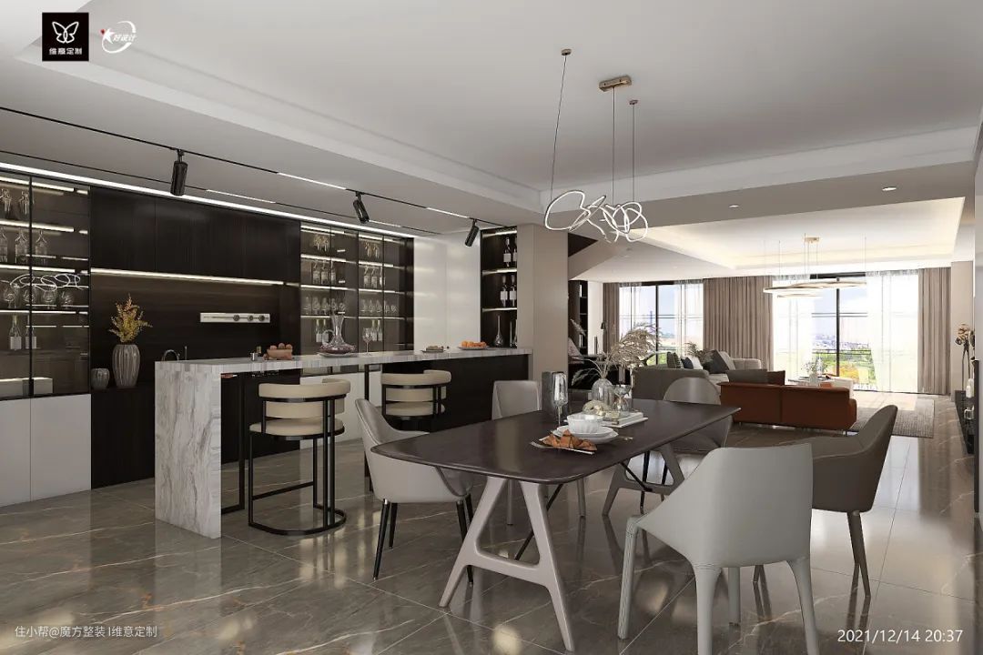 现代简约的大户型客餐厅加酒吧餐台,整体大气,餐边柜储物空间大还有单独的酒柜,设计吧台隔断餐厅,合理地利用空间。