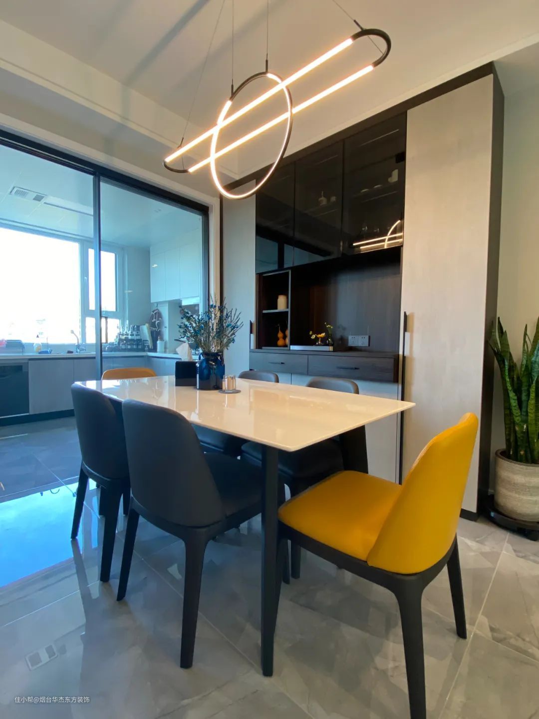▲餐厅完工。户型无玄关,考虑到入住舒适性,并未刻意增加玄关设计,入户即为餐厅,宽厅的缘故,入户也极为顺畅。餐厅家具及柜体的选择上也呼应客厅主题陈设。黄色的餐椅与深色系的搭配,赋予了餐厅更多种可能。
