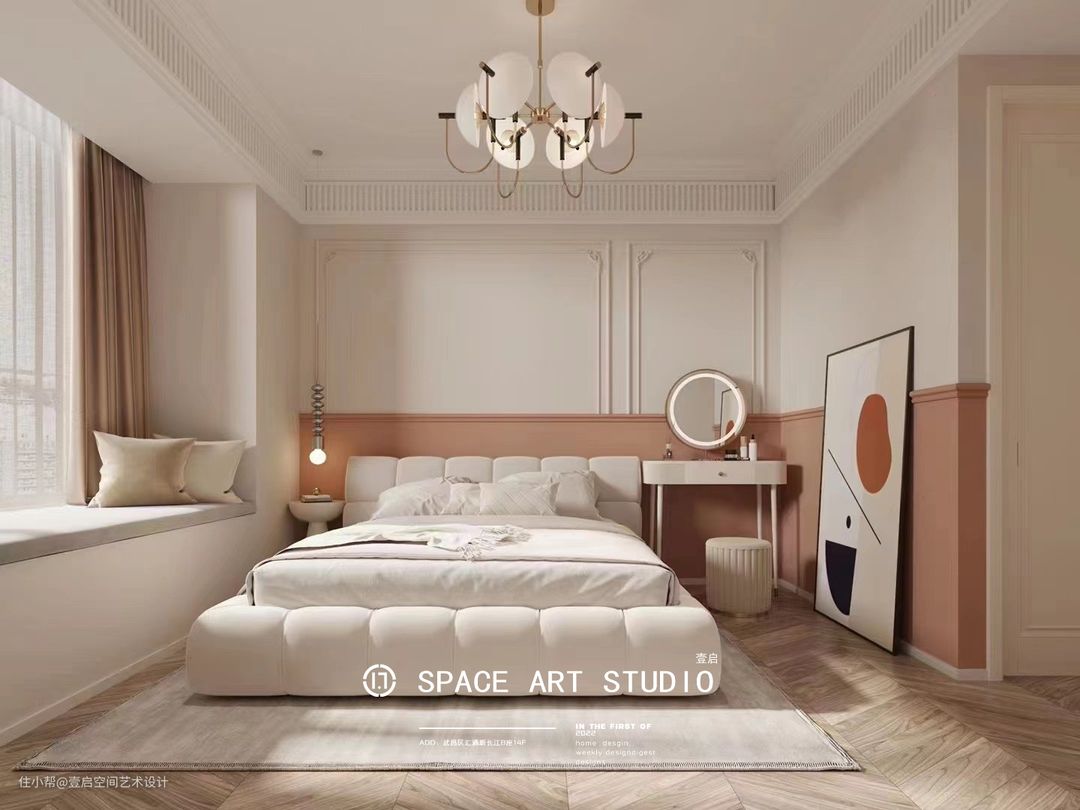 粉棕色与白色拼色床头背景墙,线雕的加入渲染出法式的精致,对称的雕花细节点缀空间浪漫优雅的情调,超适合躺平的泡芙床和奶乎乎的梳妆台,柔和的配色搭配艺术感十足的软装摆件,主卧的法式美学意境不言而喻。