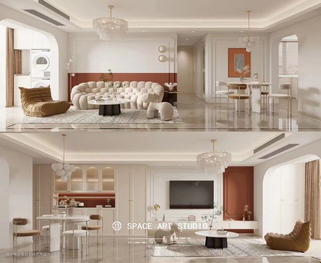 热情奔放的红色和冷清梦幻的奶白色调搭配,张扬的色彩与内敛肌理碰撞,白色与红棕色艺术漆拼色设计,搭配悬空的电视柜,整个空间层次感十足。电视背景墙用PU线条提升空间调性和精致感,减轻了传统法式的繁重感,跳跃的空间色调打造大气、舒适的空间感。