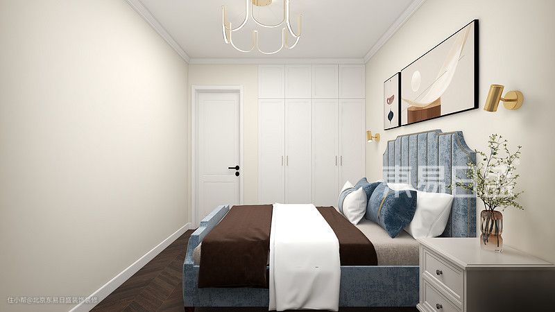 主卧以蓝灰色为基调,丝绒的床头造型;很好的缓解了带来的视觉疲劳,又给整个空间呈现出一种自带滤镜的高级色调。