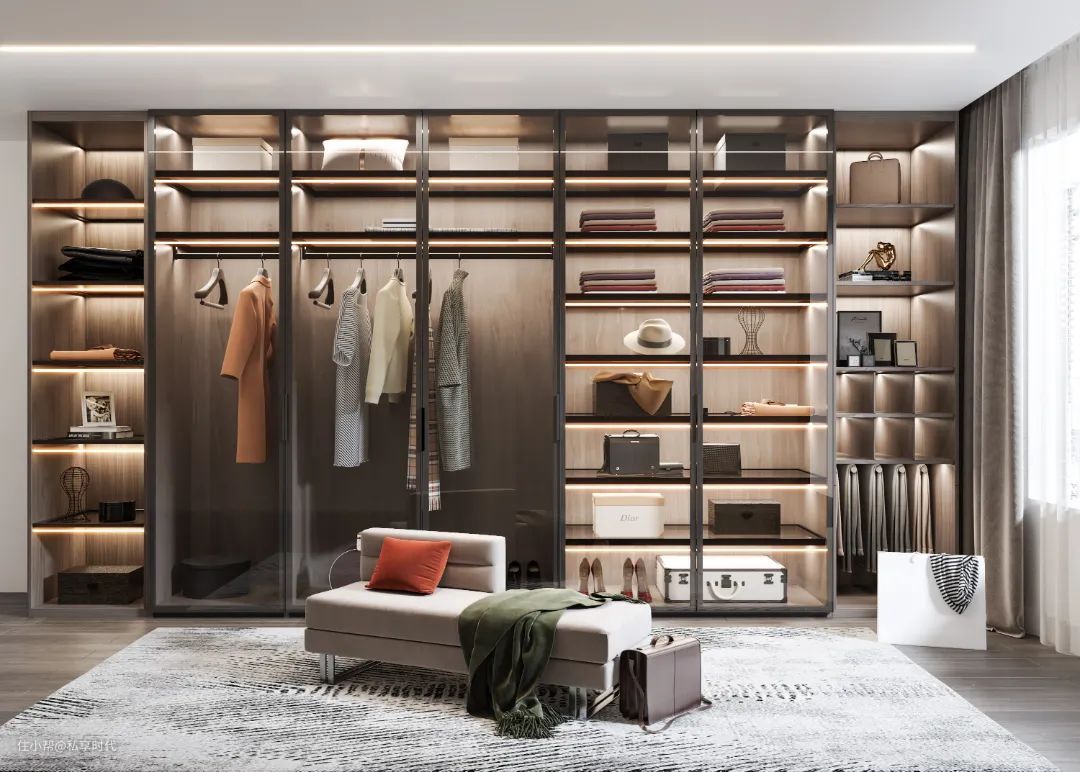 步入式衣帽间,储放空间完整,深色的木纹与玻璃的搭配,兼具着古典的气质与现代的外观,已经将整个空间的艺术气质展现的淋漓尽致。