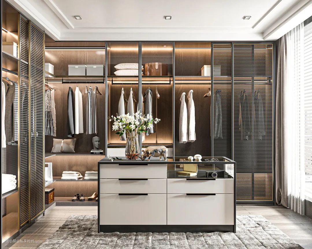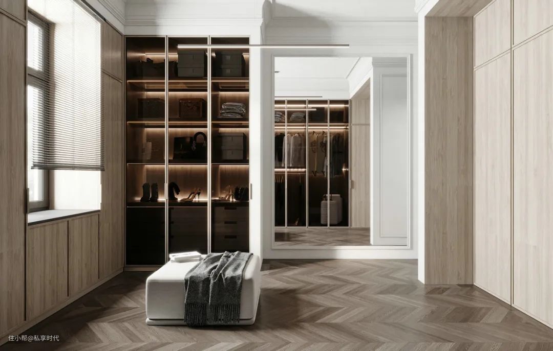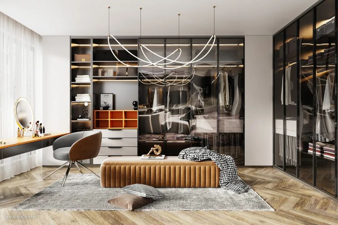 衣帽间不动声色中透露出低调的优雅,封闭与开放柜体结合,展示性与功能性兼并,在变化的韵律中营造高冷格调和神秘气质。